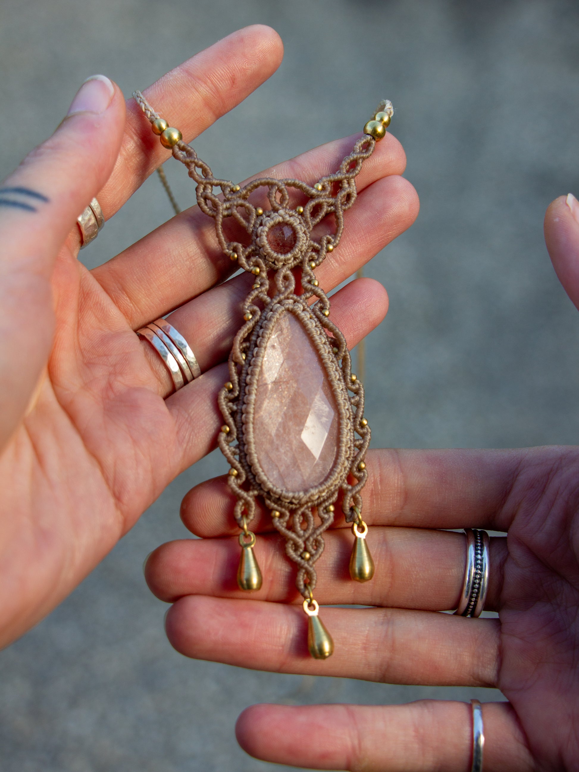 handmade macrame necklace with beautiful Strawberry Quartz & Peach Moonstone